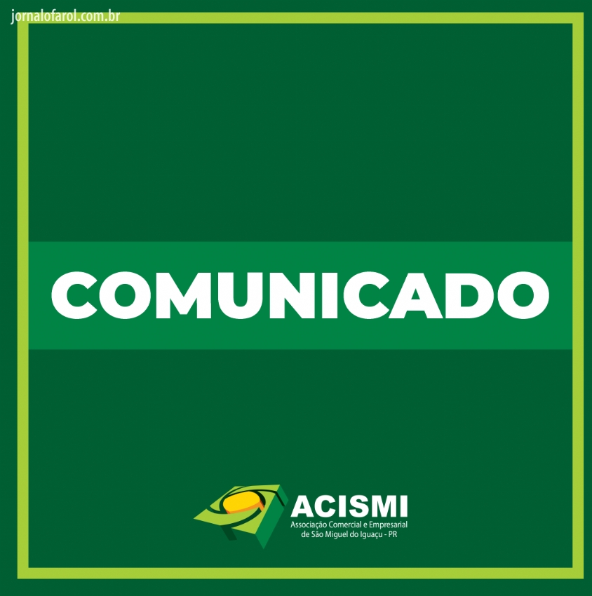 O Presidente da Associação Comercial e Empresarial de São Miguel do Iguaçu(ACISMI), Jolmir Raimundi, comunica que estão abertas as inscrições das chapas para a eleição da Diretoria Executiva Gestão 2021/2022. Os interessados a concorrer deverão manifestar-se na sede da ACISMI, Rua Duque de Caxias, 1355, Centro, São Miguel do Iguaçu/PR, até o dia 31/01, no horário compreendido das 09h00 às 17h00 seguindo a regulamentação da quinta alteração Estatutária da Associação Comercial e Empresarial de São Miguel do Iguaçu.
