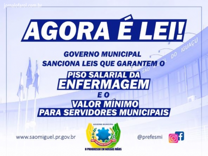 Da Assessoria - O Governo Municipal de São Miguel do Iguaçu sancionou as Leis 3.585 e 3.586/2022 que garantem o piso salarial nacional da enfermagem e o valor mínimo salarial para os servidores do quadro de pessoal estatutário e celetista do município.