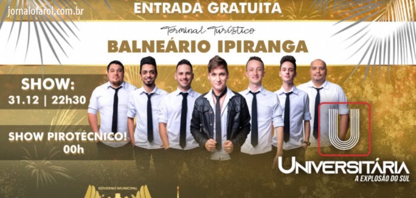 O show inicia as 22h30, com a ‘Explosão do Sul’, como é conhecida a Banda Universitária, trazendo seus sucessos e animando a galera. A 00h00 do dia 01 de janeiro será realizada uma linda queima dos fogos.
