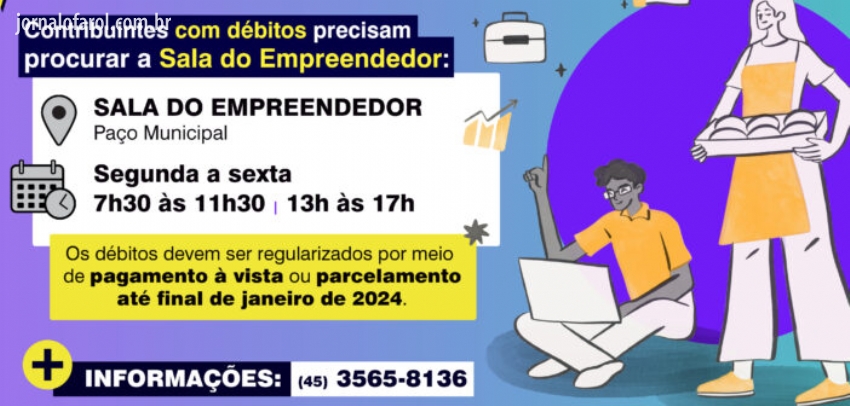 Os contribuintes com débitos devem procurar a Sala do Empreendedor que fica no Paço Municipal de segunda à sexta das 07h30 às 11h30 e das 13h00 às 17h00. Maiores informações pelo fone/watts 45-35658136.