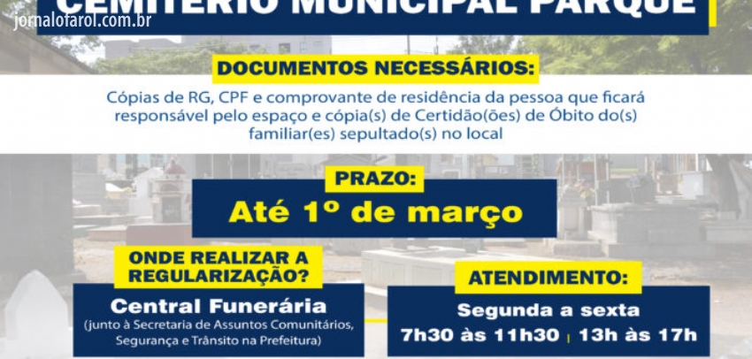 Responsáveis por sepulturas, túmulos, gavetas e/ou jazigos que tenham familiares sepultados no Cemitério Municipal Parque, deverão realizar a regularização até esse período na ‘Central Funerária’, que fica junto à Secretaria de Assuntos Comunitários, Segurança e Trânsito na prefeitura municipal.