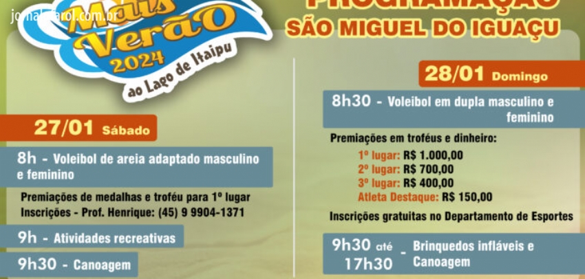 Da Assessoria - O Terminal Turístico Balneário Ipiranga vai sediar no sábado e domingo, 27 e 28, uma etapa do projeto Mais Verão nos Caminhos ao Lago de Itaipu 2024, que será realizada pelo Governo Municipal de São Miguel do Iguaçu, Conselho dos Municípios Lindeiros ao Lago de Itaipu e Itaipu Binacional.
