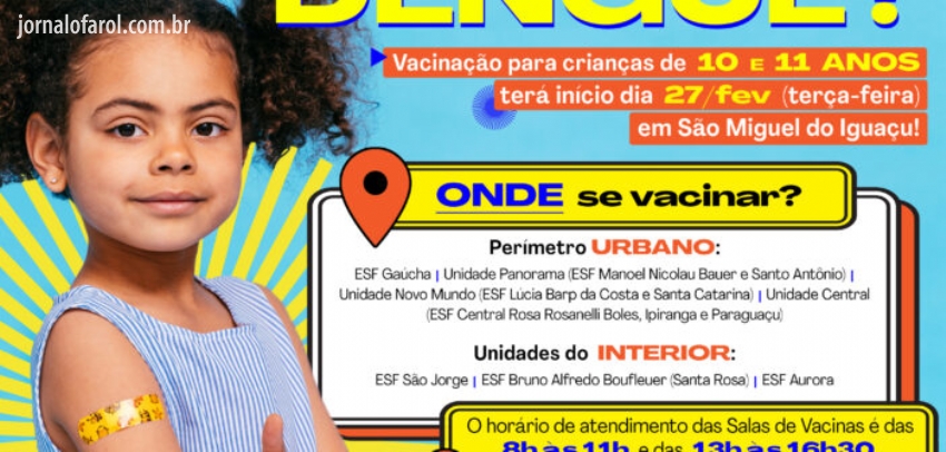 Da Assessoria - O Governo de São Miguel do Iguaçu, por intermédio da Secretaria de Saúde, vai iniciar na próxima terça-feira, 27 de fevereiro, a vacinação contra a dengue em crianças de 10 e 11 anos.