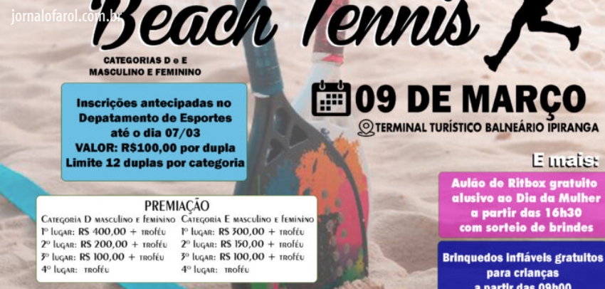Da Assessoria - O Governo Municipal de São Miguel do Iguaçu, por meio da Secretaria de Cultura, Esporte, Lazer e Turismo, vai realizar no próximo dia 09 de março, um domingo, o 1º Torneio de Beach Tennis, no Terminal Turístico Balneário Ipiranga.