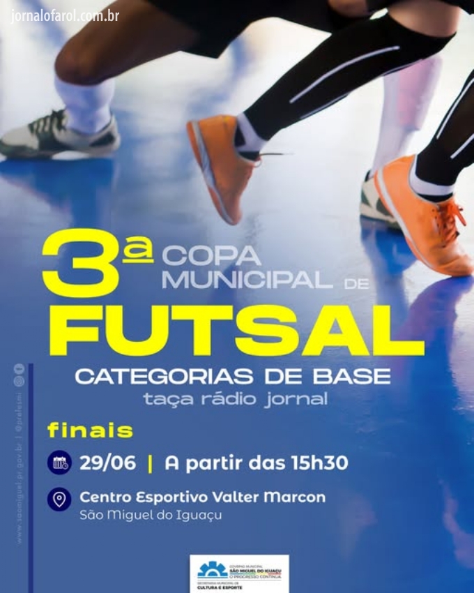 Também no fim de semana, o Centro Esportivo Valter Marcon vai ser sede das finais da 3ª Copa Municipal de Futsal Categorias de Base– Taça Rádio Jorna. Haverá jogos nesta sexta-feira, 27, a partir das 18h45. As disputas de terceiro lugar serão no sábado, 28, a partir das 15h30, e as finais no domingo, 29, a partir das 15h30. Logo após as finais, acontece o cerimonial de entrega da premiação.