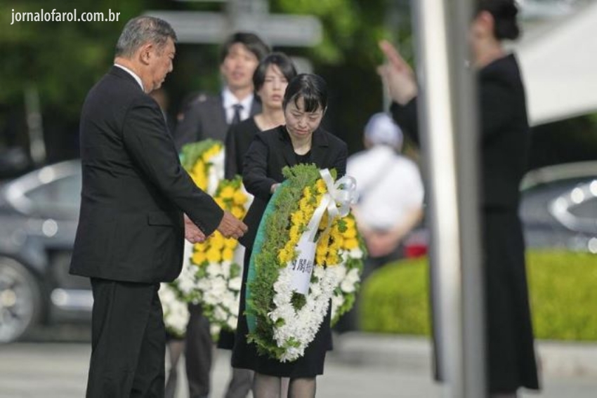 Fonte: Euronews - Foto: O primeiro-ministro do Japão, Shigeru Ishiba, oferece flores no Cenotáfio Memorial durante a cerimónia do 80º aniversário do bombardeamento de Hiroshima, Japão, quarta-feira Louise Delmotte/Copyright 2025 The AP. All rights reserved