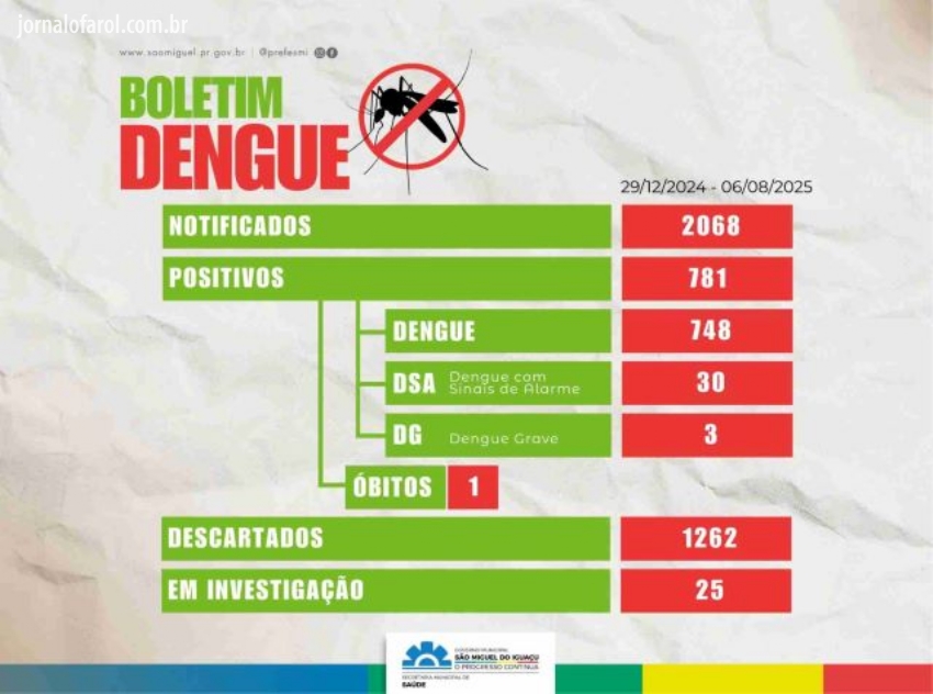 Da Assessoria -O Boletim da Dengue divulgado pela Secretaria de Saúde aponta que deste o dia 29 de dezembro de 2024, até o dia 06 de agosto/25, foram notificados 2068 casos no Município de São Miguel do Iguaçu. Sendo que destas notificações, 781 foram positivas. Dengue 781 casos, DAS 30 e DG 3, com 1 caso indo a óbito. Foram descartados 1262 casos e 25 ainda estão em investigação.