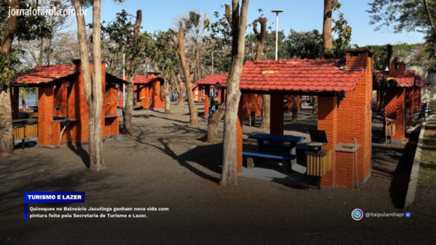 Da Assessoria - O Balneário Jacutinga, um dos principais pontos turísticos da região lindeira, colnta com uma estrutura invejável para receber os veranistas e visitantes e os quiosques localizados na área de lazer estão sendo repintados pela equipe da Secretaria de Turismo e Lazer, em uma ação que visa valorizar ainda mais o espaço e proporcionar um ambiente mais acolhedor para moradores e visitantes. A iniciativa faz parte de um cronograma de manutenção e embelezamento do Balneário.