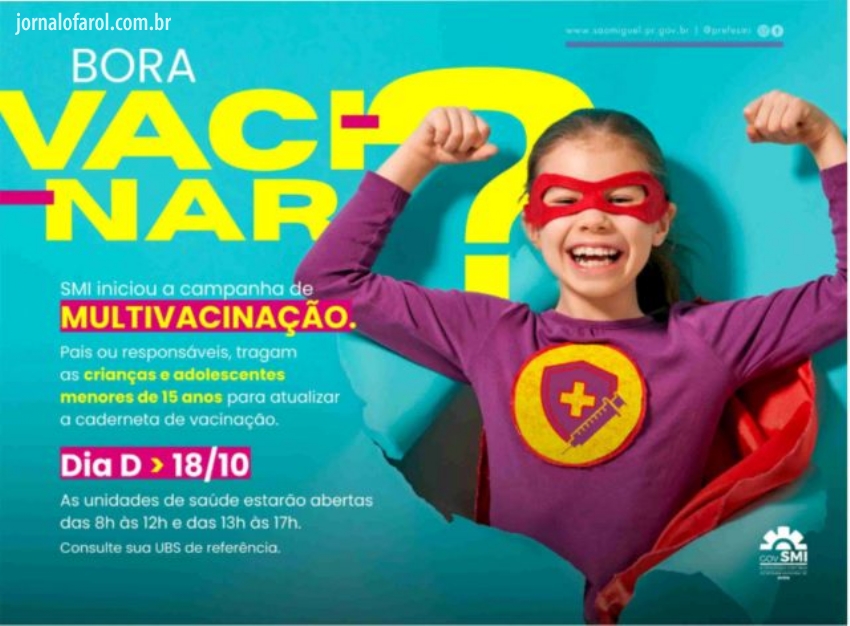 Da Assessoria - O Governo Municipal de São Miguel do Iguaçu, por meio da Secretaria de Saúde, vai iniciar no próximo dia 06 de outubro a Estratégia de Multivacinação, com foco na atualização da caderneta de vacinação de crianças e adolescentes menores de 15 anos (até 14 anos, 11 meses e 29 dias).