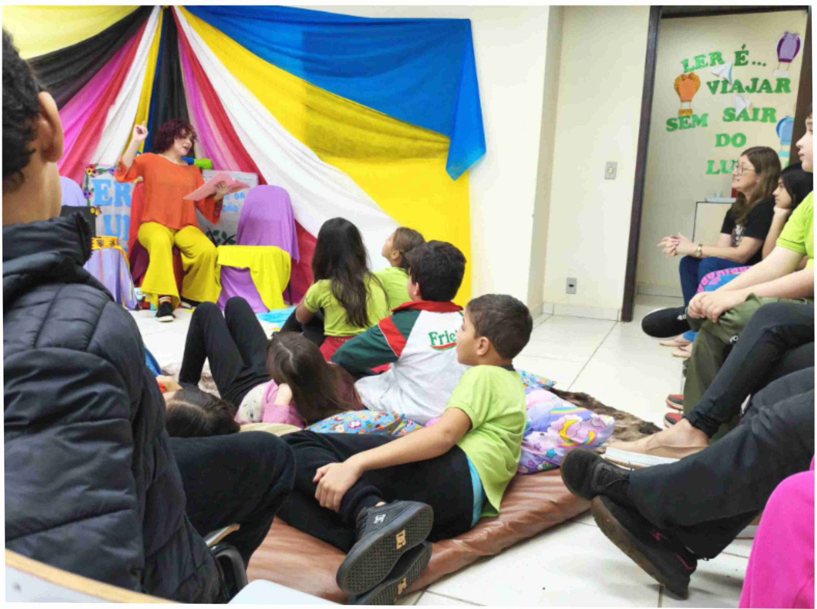 Durante a ação, as crianças puderam assistir à encenação da história “Dragões e Bolhas de Sabão”, conduzida de forma interativa e lúdica. Uma turma da rede municipal de ensino participou da atividade, auxiliando a autora em alguns dos desafios propostos ao longo da narrativa, tornando o momento ainda mais divertido e educativo.