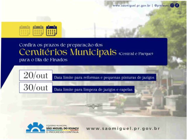 Da Assessoria - O Governo Municipal de São Miguel do Iguaçu, por meio da Secretaria de Assuntos Comunitários, informa que qualquer reforma em jazigos deve ser previamente autorizada pela Central de Luto, localizada no andar térreo do Paço Municipal Abel Bez Batti, ao lado do calçadão dos bancos.