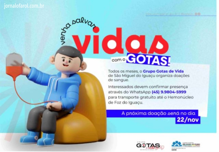 Da Assessoria - O Grupo Gotas de Vida, vinculado à Secretaria Municipal de Saúde de São Miguel do Iguaçu, convida a comunidade para participar de um dia de doação de sangue no sábado, 22 de novembro.