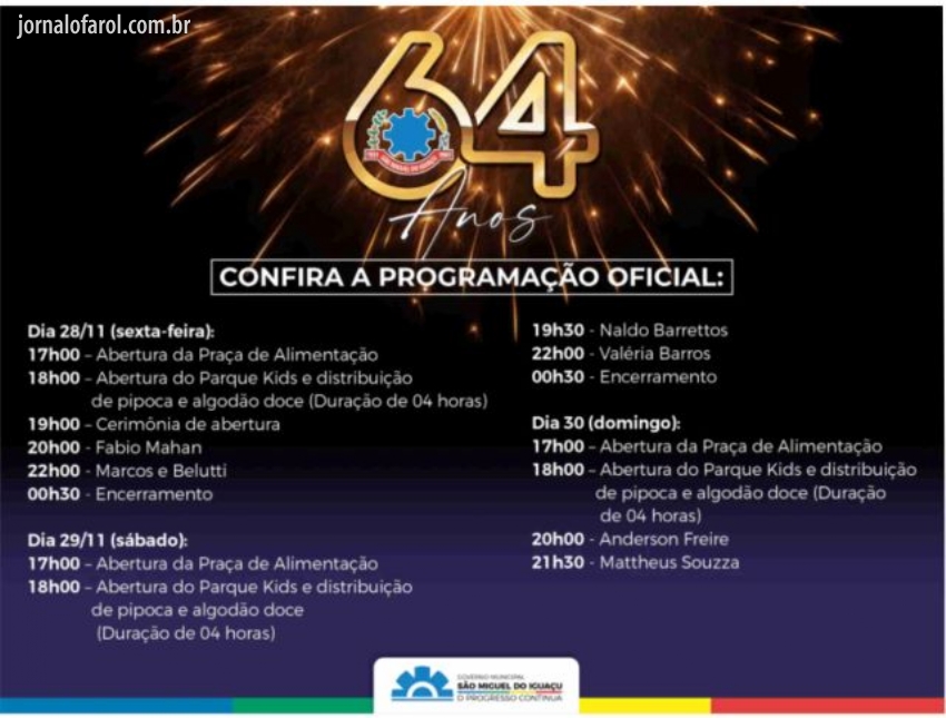 Da Assessoria - O aniversário de 64 anos de São Miguel do Iguaçu será celebrado com uma grande festa entre os dias 28 e 30 de novembro, reunindo atrações para toda a família e shows nacionais gratuitos. A programação especial destaca mais um ano de crescimento, desenvolvimento e união da comunidade são-miguelense.