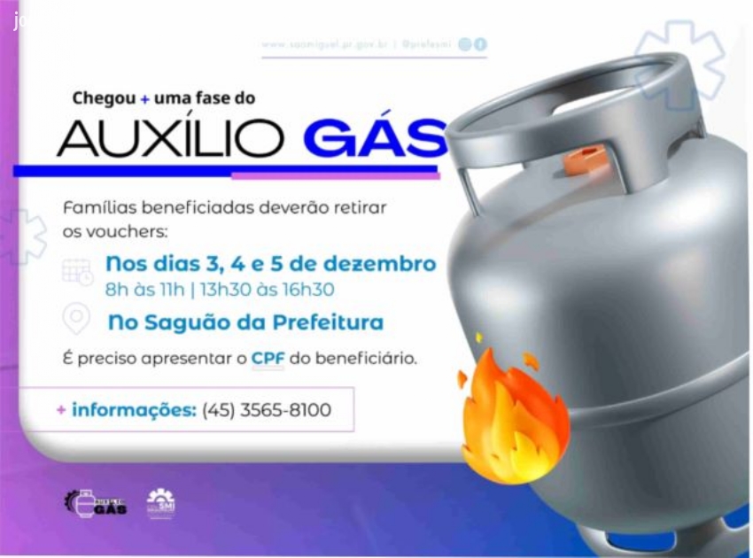 Da Assessoria - O Governo Municipal de São Miguel do Iguaçu, por meio da Secretaria de Assistência Social, vai entregar nesta quarta (03), quinta (04) e sexta-feira (05), os vouchers da 3ª fase de 2025 do programa municipal ‘Auxílio Gás’.