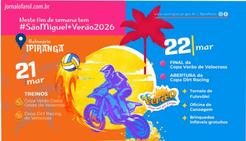 O secretário municipal de Cultura e Esporte, Sandro Alexandre (Tatu), destaca que o objetivo da programação é fortalecer o turismo e a prática esporte, além de proporcionar momentos de lazer para a comunidade. “O São Miguel Mais Verão foi pensado para movimentar o nosso Balneário Ipiranga e oferecer opções de esporte, diversão e convivência para todas as idades. Teremos um fim de semana com muita adrenalina no velocross, competição no futevôlei e atividades recreativas para as famílias, valorizando ainda mais esse espaço tão importante para o município”, ressaltou.