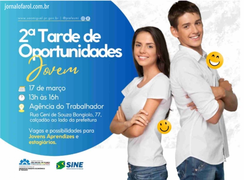 Da Assessoria - A Agência do Trabalhador (SINE) de São Miguel do Iguaçu, vinculada à Secretaria Municipal de Desenvolvimento Econômico e Turismo, realizará na próxima terça-feira, 17 de março, uma Tarde de Oportunidades voltada a jovens aprendizes e estagiários.