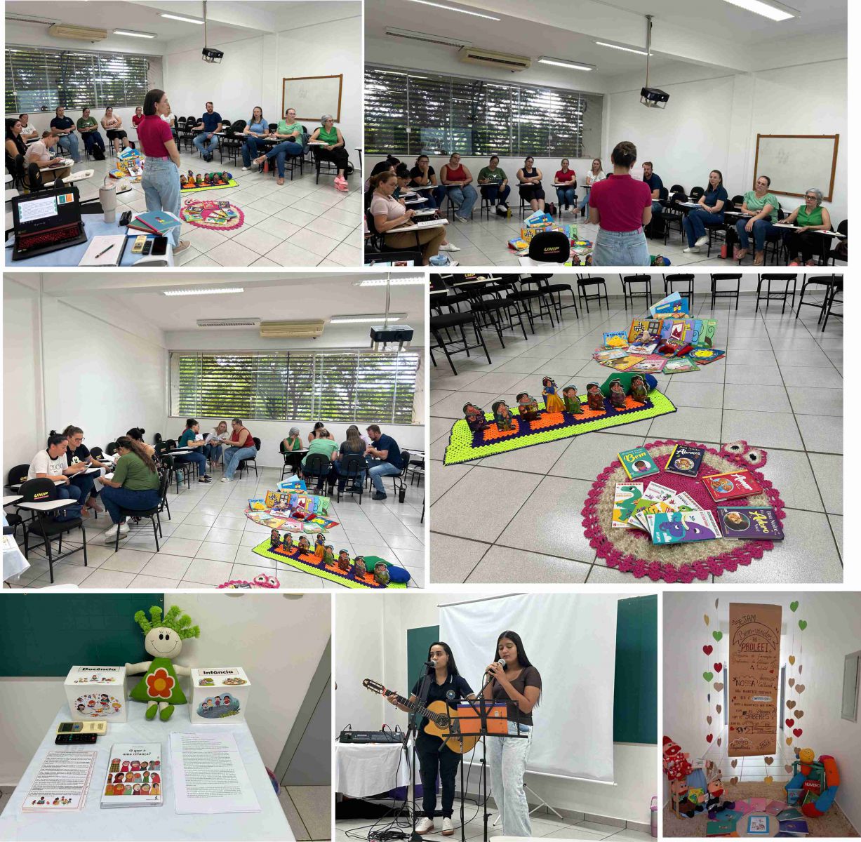 Durante o encontro, as professoras também participaram de momentos de reflexão sobre suas trajetórias pessoais e profissionais, discutindo concepções de infância, docência e as especificidades do trabalho pedagógico com crianças pequenas.