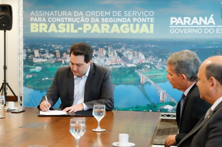 Assessoria - foto: Rodrigues Félix Leal - Ag Notícias/Paraná - Até a próxima terça-feira (6), as imediações do Marco das Três Fronteiras, em Foz do Iguaçu, onde será construída a Ponte da Integração Brasil-Paraguai, serão tomadas pelos maquinários e operários que darão início às obras. A ordem de serviço foi assinada nesta quinta-feira (1º) pelo governador do Paraná, Carlos Massa Ratinho Júnior, e pelo diretor-geral brasileiro da Itaipu, general Joaquim Silva e Luna. O contrato prevê um prazo de 36 meses para a execução.