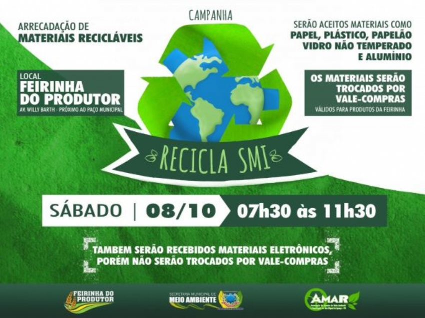 Da Assessoria - O Governo Municipal de São Miguel do Iguaçu, por intermédio da secretaria de Meio Ambiente, vai realizar neste sábado, 08 de outubro, em parceria com a AMAR (Associação dos Agentes de Meio Ambiente e Reciclagem) e os feirantes da Feira do Produtor, a edição mensal da campanha Recicla SMI.