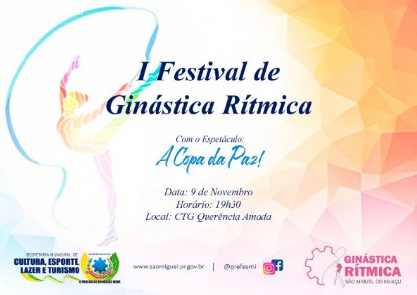Da Assessoria - O Governo Municipal de São Miguel do Iguaçu, por meio da secretaria de Cultura, Esporte, Lazer e Turismo, vai realizar no próximo dia 09 de novembro o 1° Festival de Ginástica Rítmica de São Miguel do Iguaçu, com o espetáculo ‘A Copa da Paz’.