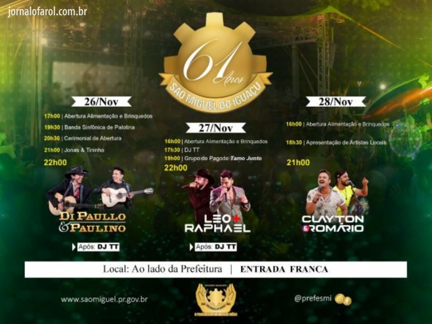 Da Assessoria - O Governo Municipal de São Miguel do Iguaçu definiu a programação das festividades de comemoração do Aniversário de 61 anos do município, que serão realizadas de 26 a 28 de novembro, nas proximidades do Paço Municipal.