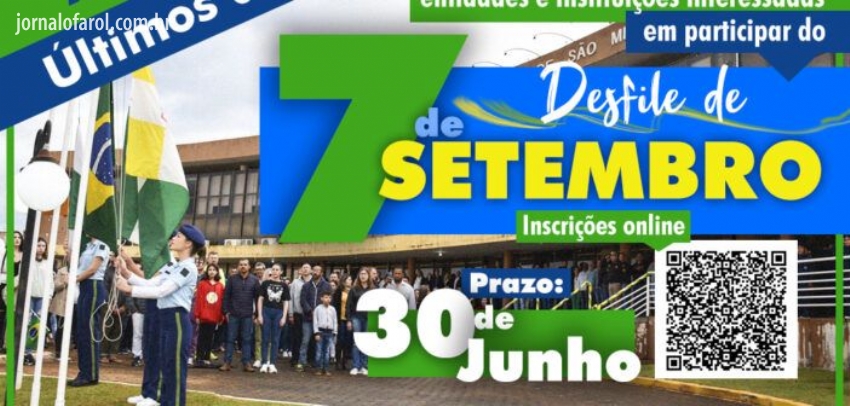 Da Assessoria - O Governo Municipal de São Miguel do Iguaçu alerta que o prazo para inscrições de entidades e instituições interessadas em participar do desfile cívico em comemoração ao 7 de Setembro termina nesta sexta-feira, 30 de junho.