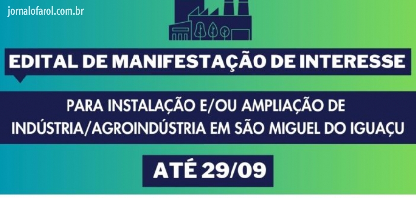 Da Assessoria - O Governo Municipal de São Miguel do Iguaçu publicou no Diário Oficial Eletrônico (DOE) o edital de manifestação de interesse para instalação e/ou ampliação de indústria/agroindústria no município, que visa mapear a demanda e incentivar a geração de empregos e renda. O objetivo é impulsionar a instalação e ampliação de empresas no município.