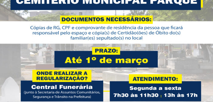 Responsáveis por sepulturas, túmulos, gavetas e/ou jazigos que tenham familiares sepultados no Cemitério Municipal Parque, deverão realizar a regularização até esse período na ‘Central Funerária’, que fica junto à Secretaria de Assuntos Comunitários, Segurança e Trânsito na prefeitura municipal.