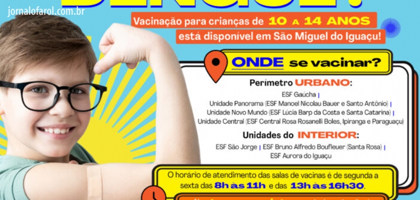 A aplicação das doses contra a dengue está sendo realizada no horário das 08h00 às 11h00 e das 13h00 às 16h30, em 07 Unidades Básicas de Saúde (UBS) do município: