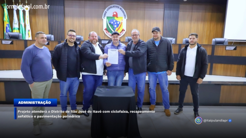 Da Assessoria - Na última quinta-feira (29), o Prefeito Lindolfo Rui, juntamente com o Secretário de Obras Vilso Nei Serena, protocolou, junto à Câmara de Vereadores de Itaipulândia, o Projeto de Lei nº 029/2025 que trata de autorização para abertura de Crédito Adicional Suplementar no valor de R$3.955.000,00 (três milhões, novecentos e cinquenta e cinco reais) com o objetivo de implantação de ciclofaixa, pavimentação asfáltica e poliédrica em São José doo Itavó. O Projeto foi entregue ao Presidente da Câmara Abel David Serena, que estava acompanhado de demais vereadores.