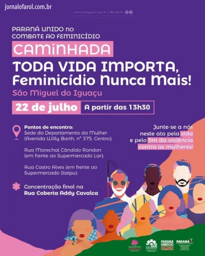 Da Assessoria - O Governo Municipal de São Miguel do Iguaçu, por intermédio do Departamento de Políticas Públicas para Mulheres, vinculado à Secretaria de Assistência Social, vai realizar no próximo dia 22 de julho uma caminhada no centro da cidade, como parte das ações da campanha estadual “Paraná Unido no Combate ao Feminicídio”, que movimenta e chama a sociedade à reflexão frente ao feminicídio.