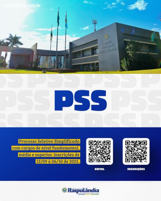 Da Assessoria - O Município de Itaipulândia anuncia a abertura de edital para o Processo Seletivo Simplificado (PSS), os cargos serão de nível fundamental, médio e superior.