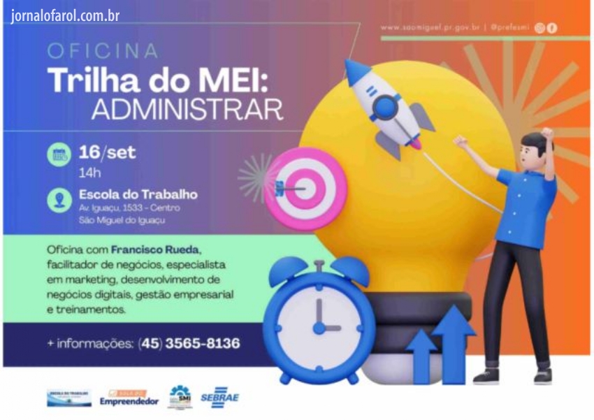 No dia 16 de setembro, terça-feira, acontecerá a oficina “Trilha do MEI: Administrar”, com Francisco Rueda, facilitador de negócios, especialista em marketing, desenvolvimento de negócios digitais, gestão empresarial e treinamentos.