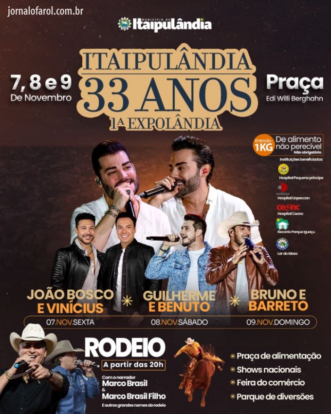 Da Assessoria - Três noites de muita festa e comemoração te esperam na maior celebração de Itaipulândia: dias 07, 08 e 09 de novembro, na Praça Edi Willi Berghahn. Você não pode ficar de fora, olha só o que vem por aí: