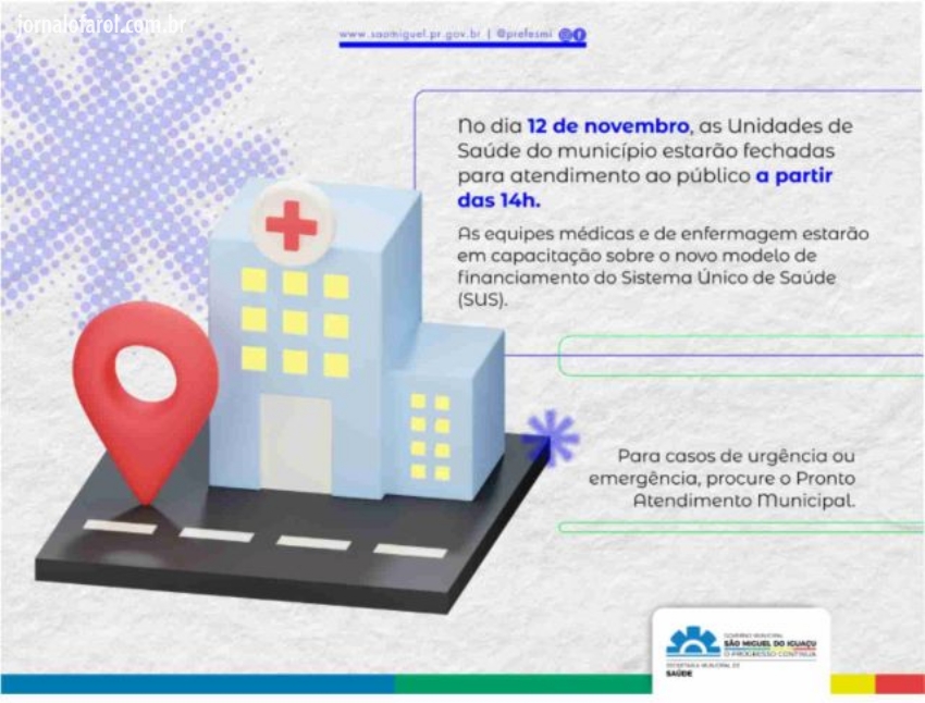 Da Assessoria - O Governo Municipal de São Miguel do Iguaçu, por meio da Secretaria de Saúde, informa que as Unidades de Saúde do município estarão com o atendimento ao público suspenso a partir das 14h00 desta quarta-feira, 12 de novembro.