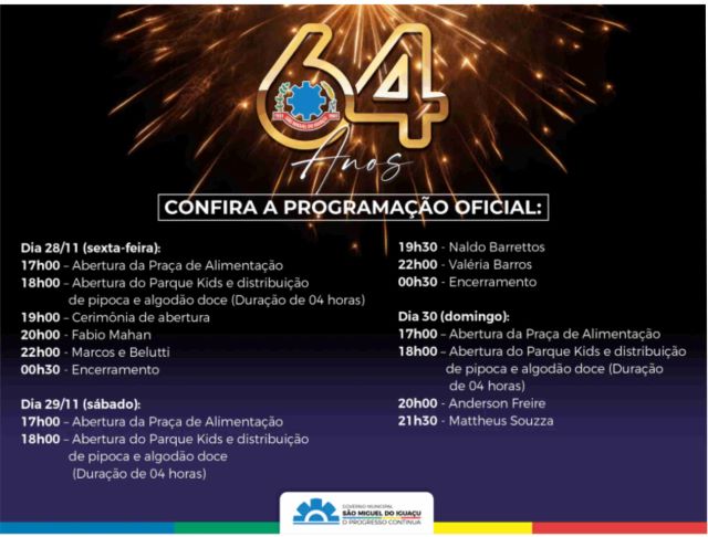 Da Assessoria - O aniversário de 64 anos de São Miguel do Iguaçu será celebrado com uma grande festa entre os dias 28 e 30 de novembro, reunindo atrações para toda a família e shows nacionais gratuitos. A programação especial destaca mais um ano de crescimento, desenvolvimento e união da comunidade são-miguelense.