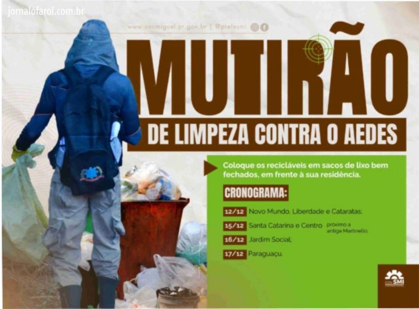 Da Assessoria - O Governo Municipal de São Miguel do Iguaçu vai realizar um mutirão de limpeza em diversos bairros do município para combater a proliferação do mosquito Aedes aegypti. A ação ocorre em meio ao estado de alerta máximo, emitido após o registro de 788 casos de dengue, 39 casos de chikungunya e o aumento expressivo de focos do mosquito em residências e terrenos particulares.