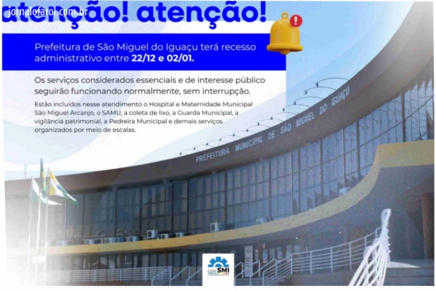 Da Assessoria - O Governo Municipal de São Miguel do Iguaçu informa que, conforme o Decreto nº 991/2025, publicado no Diário Oficial Eletrônico, será estabelecido recesso administrativo nas repartições públicas municipais no período de 22 de dezembro de 2025 a 02 de janeiro de 2026.