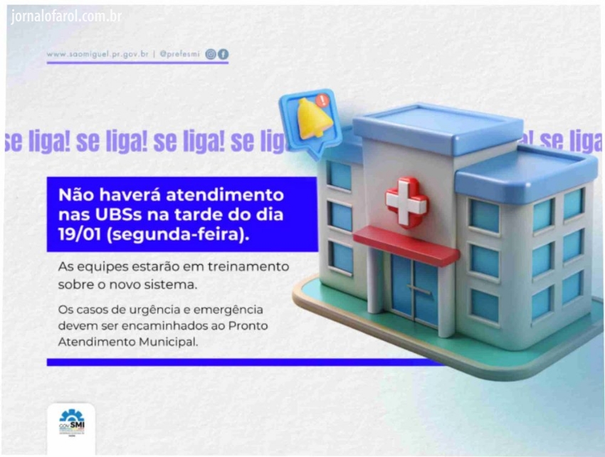 Da Assessoria - O Governo Municipal de São Miguel do Iguaçu, por intermédio da Secretaria de Saúde, informa que as Unidades Básicas de Saúde (UBS) vão estar fechadas na próxima segunda-feira,19, no período da tarde.