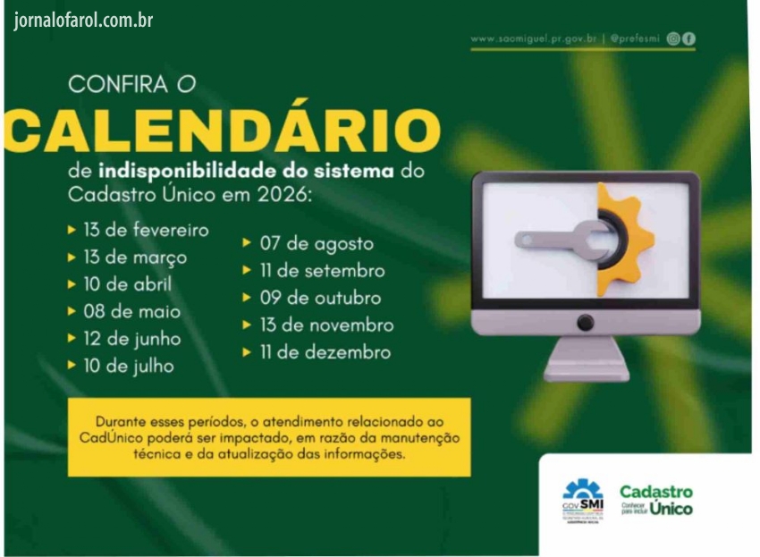 Da Assessoria - O Governo Municipal de São Miguel do Iguaçu, por meio do Centro de Referência de Assistência Social (CRAS), vinculado à Secretaria de Assistência Social, divulgou o calendário de indisponibilidade do Sistema do Cadastro Único (CadÚnico) para o ano de 2026.