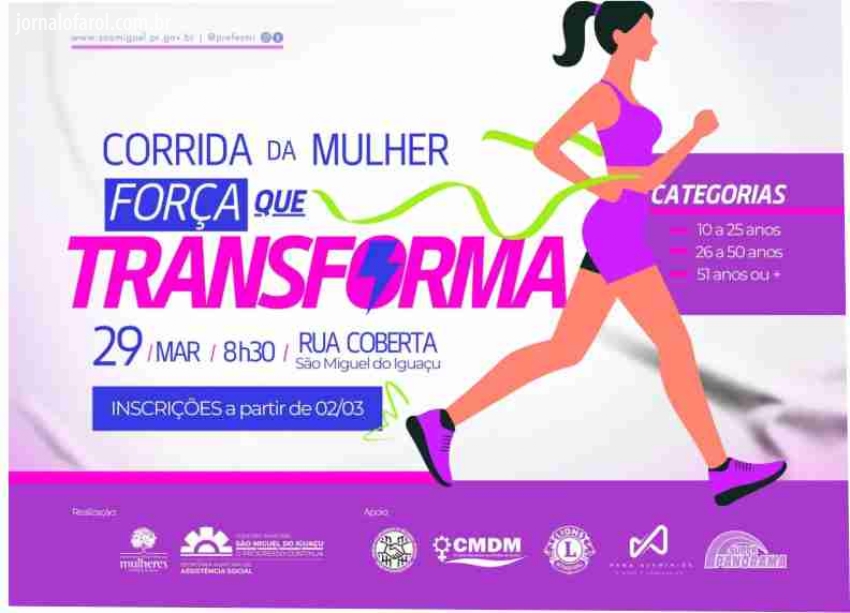 Da Assessoria - O Governo Municipal de São Miguel do Iguaçu, por meio do Departamento de Políticas Públicas para Mulheres, vinculado à Secretaria Municipal de Assistência Social, vai promover no próximo dia 29 de março a Corrida da Mulher – “Força que Transforma”. A ação integra a programação do mês de março em comemoração ao Dia Internacional da Mulher.