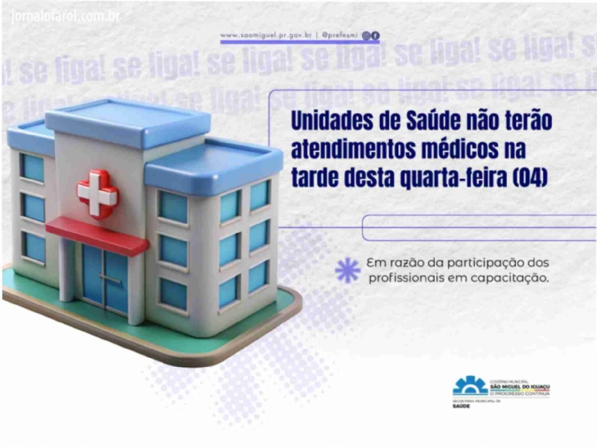 Da Assessoria - O Governo Municipal de São Miguel do Iguaçu, por meio da Secretaria de Saúde, informa que não haverá atendimento médico nas Unidades Básicas de Saúde na tarde desta quarta-feira, dia 04 de março, em razão da participação dos profissionais em capacitação.
