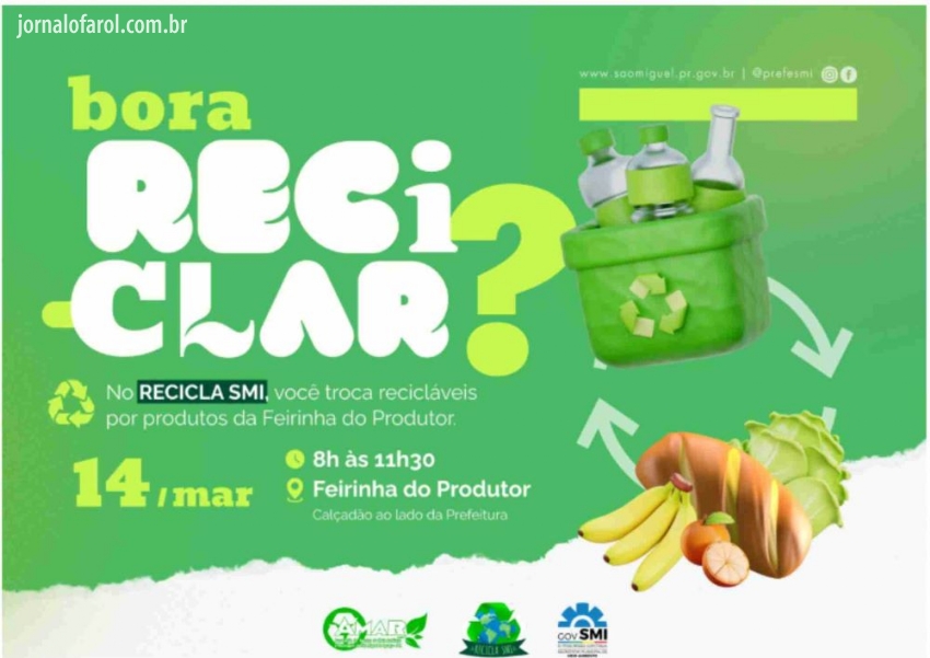 Da Assessoria - O Governo Municipal de São Miguel do Iguaçu, por meio da Secretaria Municipal de Meio Ambiente, realiza neste sábado, dia 14, mais uma edição da campanha Recicla SMI. A ação acontece na Feira do Produtor, próxima à prefeitura, das 08h00 às 11h00.