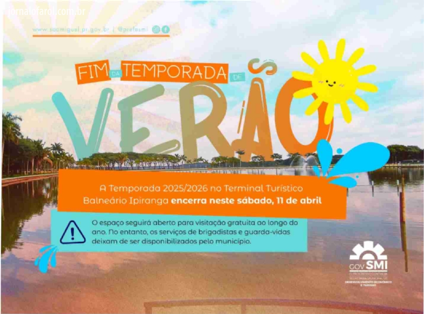 Da Assessoria - O Governo Municipal de São Miguel do Iguaçu, por meio da Secretaria de Desenvolvimento Econômico e Turismo, informa que a Temporada de Verão 2025/2026 no Terminal Turístico Balneário Ipiranga será encerrada neste sábado, dia 11 de abril.