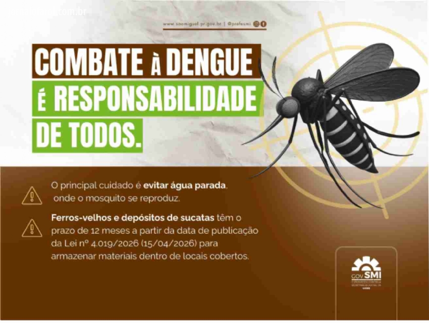 Da Assessoria - O Governo Municipal de São Miguel do Iguaçu, por meio da Secretaria de Saúde, reforça as principais medidas previstas na Lei nº 4.019/2026, que estabelece normas para o controle e prevenção de doenças como dengue, chikungunya, zika e febre amarela no município.