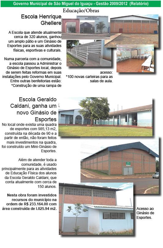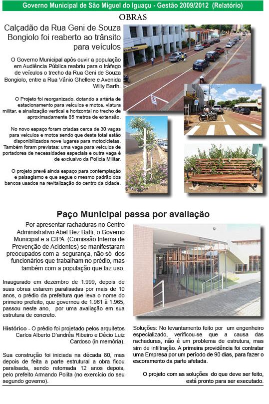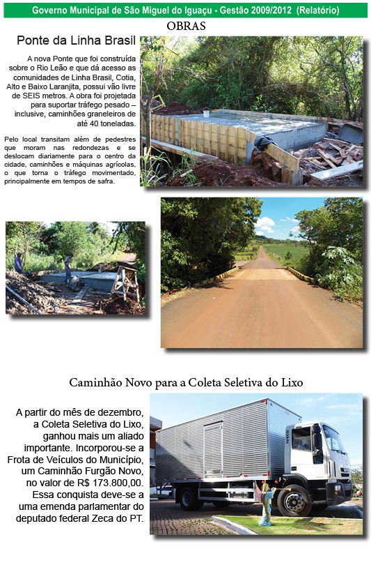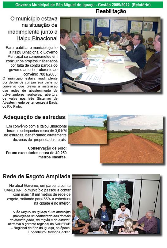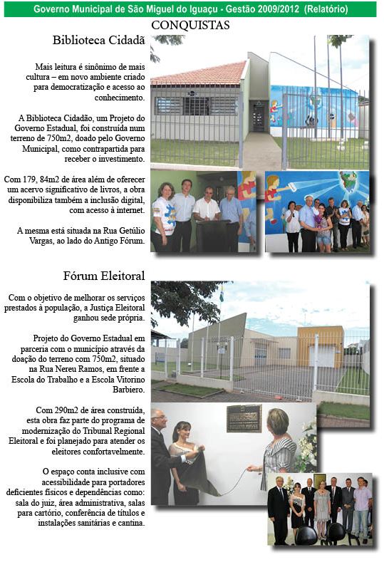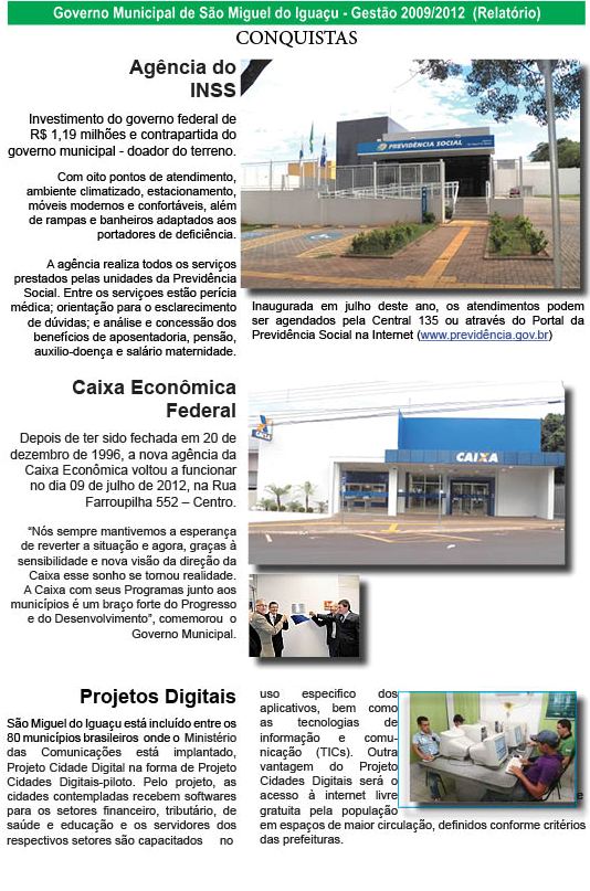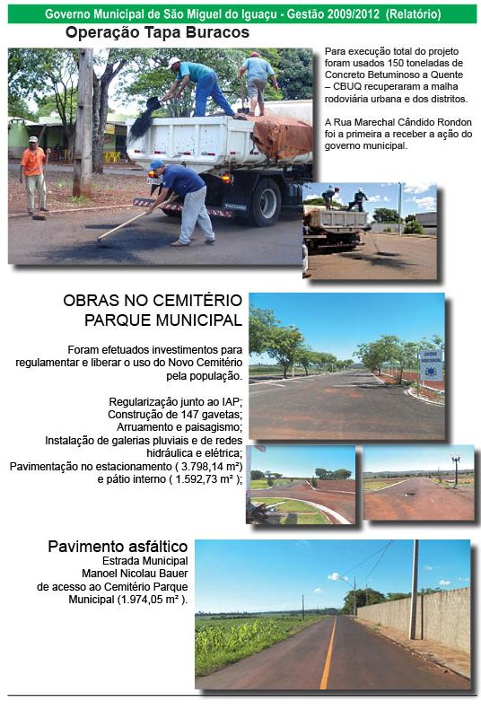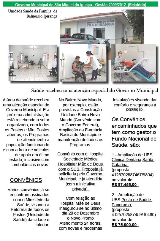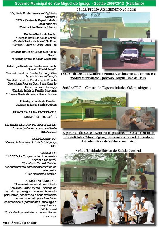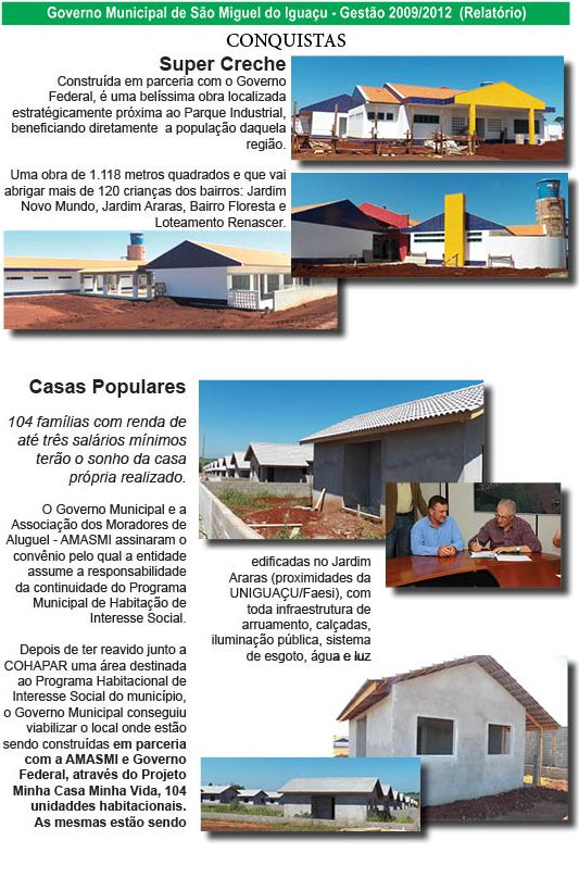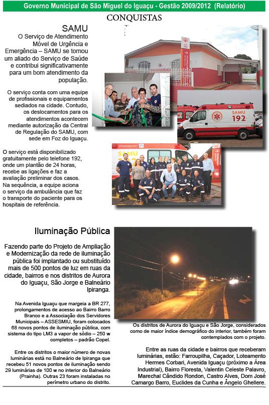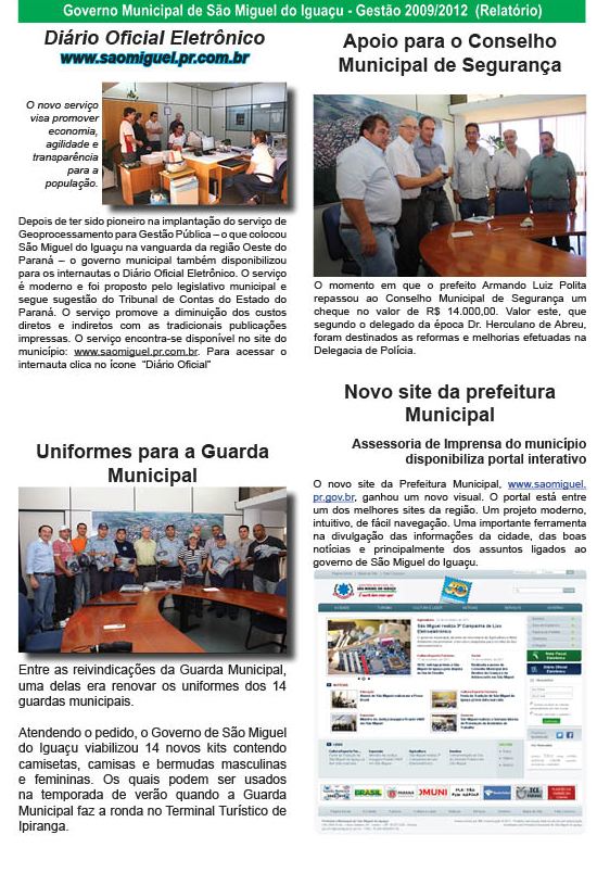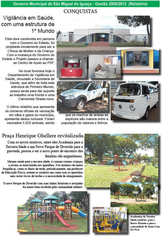 Confira as ações do Governo Municipal de São Miguel do Iguaçu na Gestão 2009/2012. O presente relatório foi efetuado pelo nosso site: www.jornalofarol.com.br. Parte das fotos é do acervo da Assessoria de Imprensa da Prefeitura Municipal.