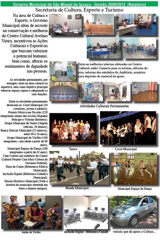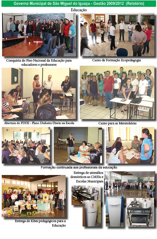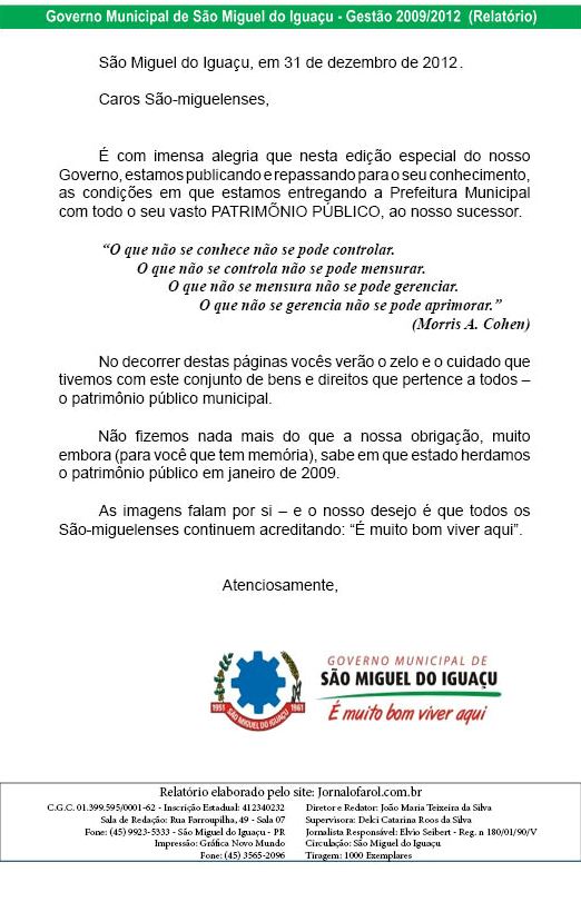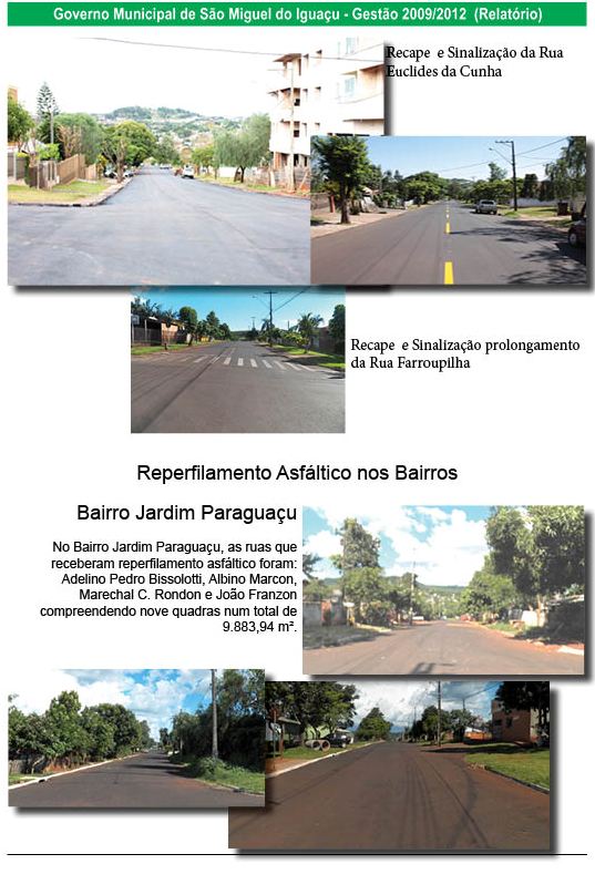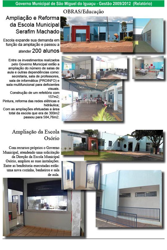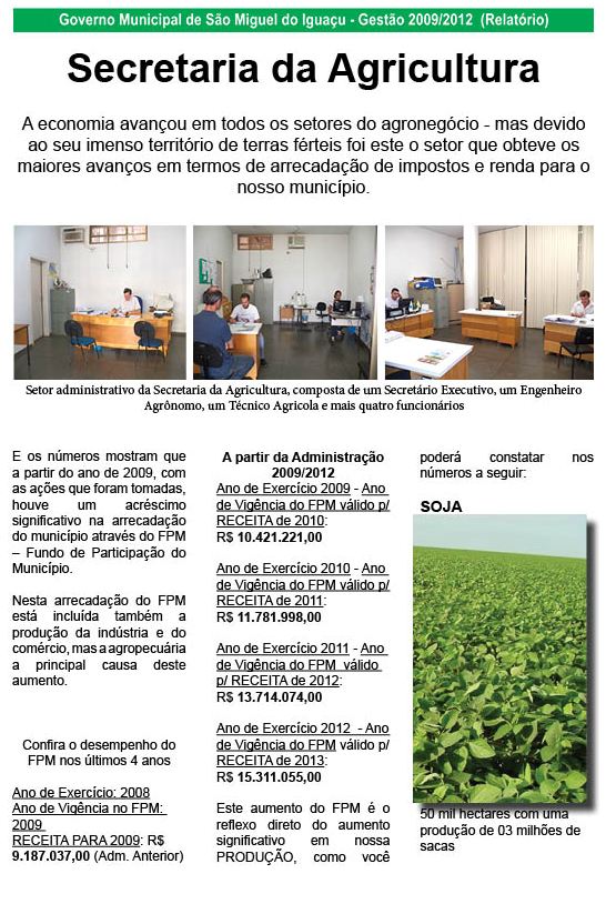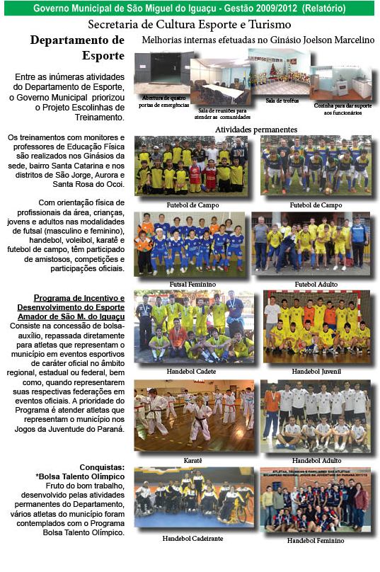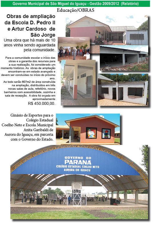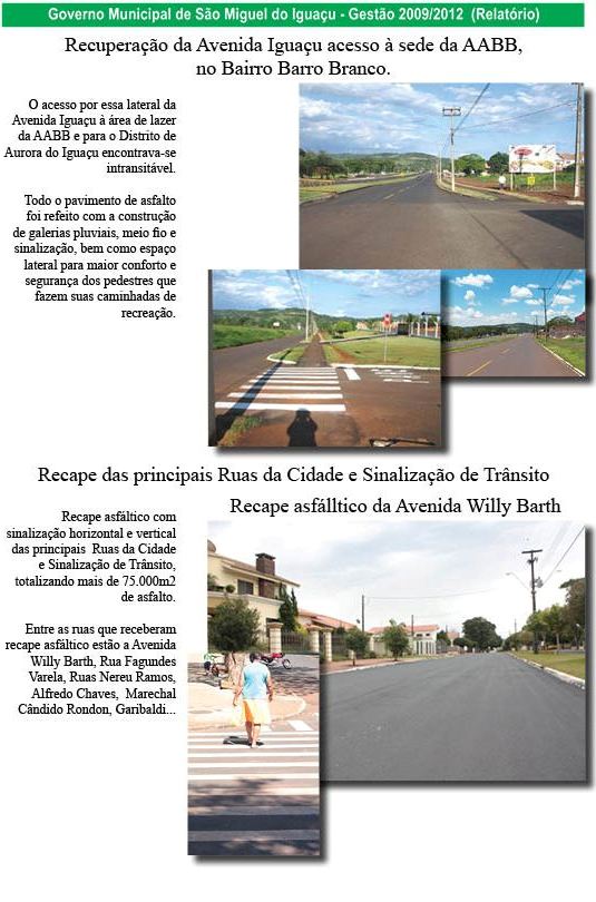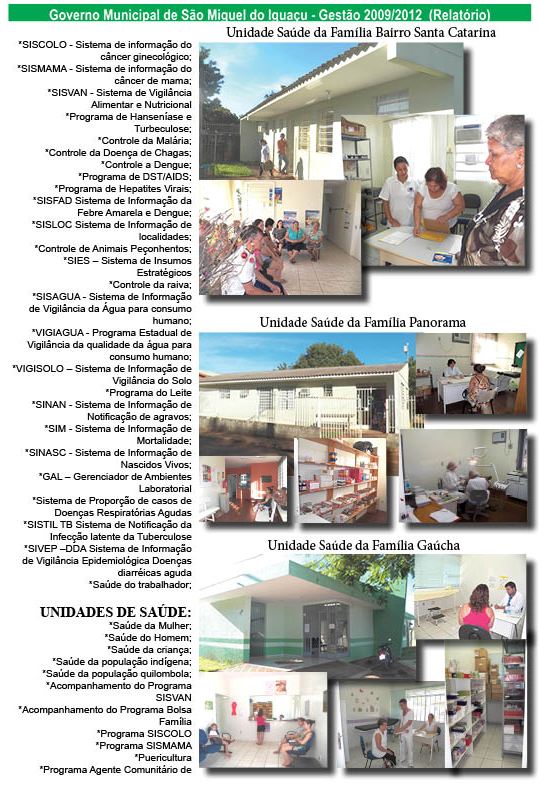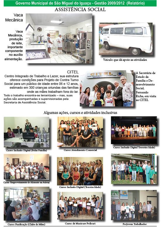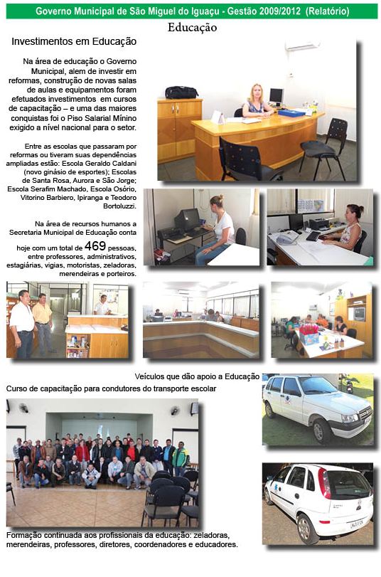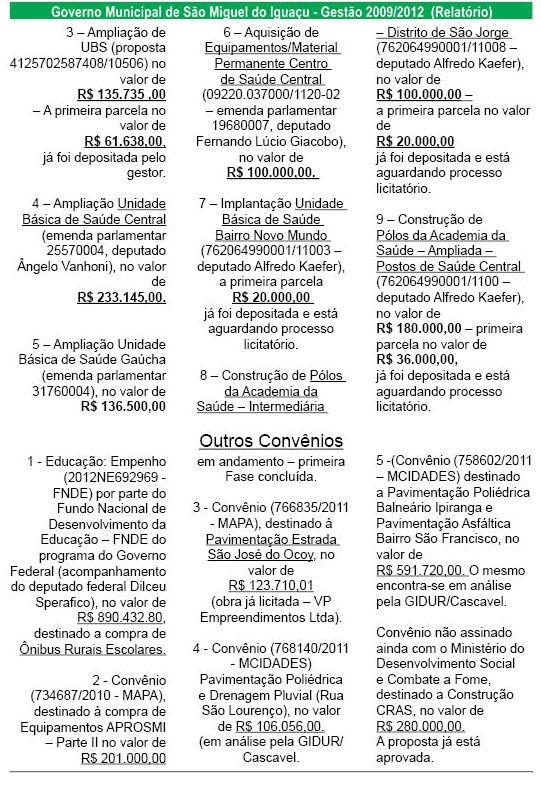 Confira as ações do Governo Municipal de São Miguel do Iguaçu na Gestão 2009/2012. O presente relatório foi efetuado pelo nosso site: www.jornalofarol.com.br. Parte das fotos é do acervo da Assessoria de Imprensa da Prefeitura Municipal.